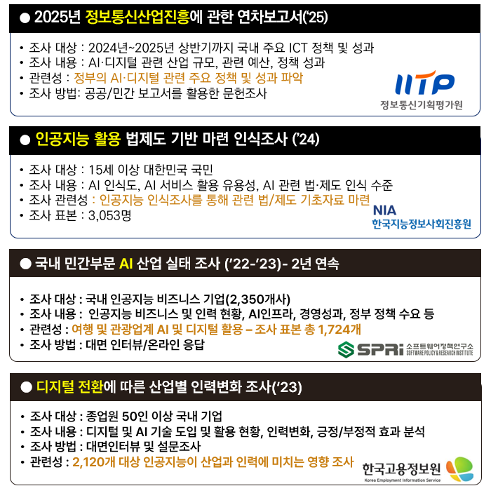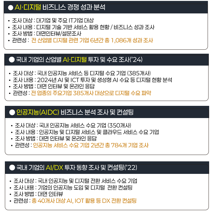 예컨대 AI 및 디지털 분야 주요 기업의 기술·경영 경쟁력을 다각도로 평가하는 동시에, 실제 수요기업의 AI·디지털 도입 현황과 수요 패턴, 현장에서의 페인 포인트(Pain Point)까지 분석해 정책과 비즈니스 모두에 적용 가능한 실질적 해법을 제시할 수 있습니다.