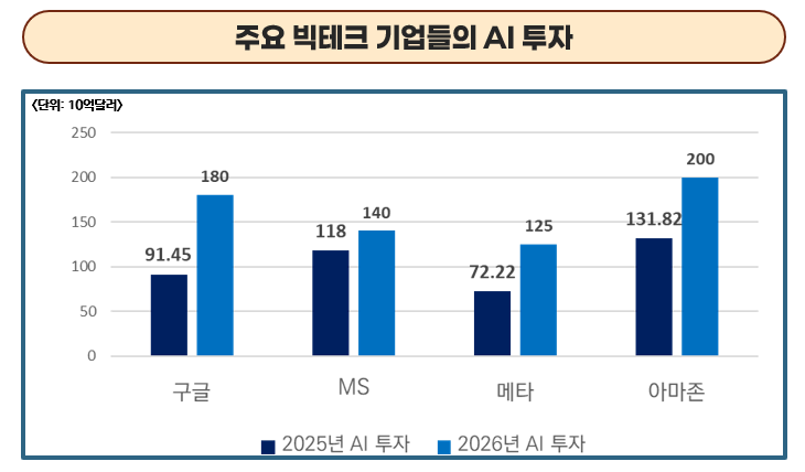 - 마이크로소프트·아마존·알파벳·메타 4개사가 2026년에 데이터센터·칩 등 AI 인프라에 약 6,350억 달러를 지출할 계획