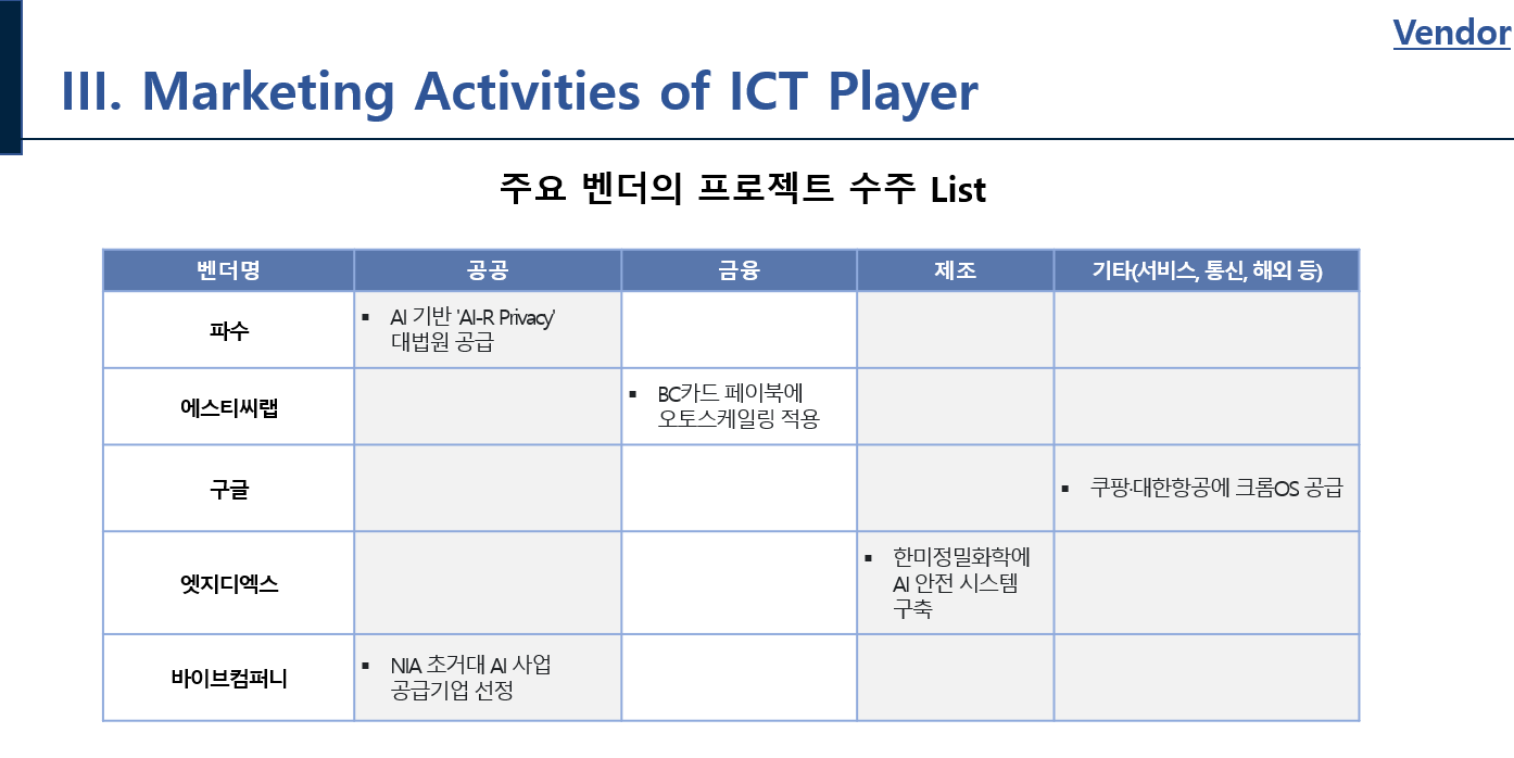 삼성SDS, 포스코ITX, IBM 등 국내외 주요 기업들이 시장정보 서비스를 구매해 자사 전략 수립에 중요한 자료로 활용하고 있습니다.