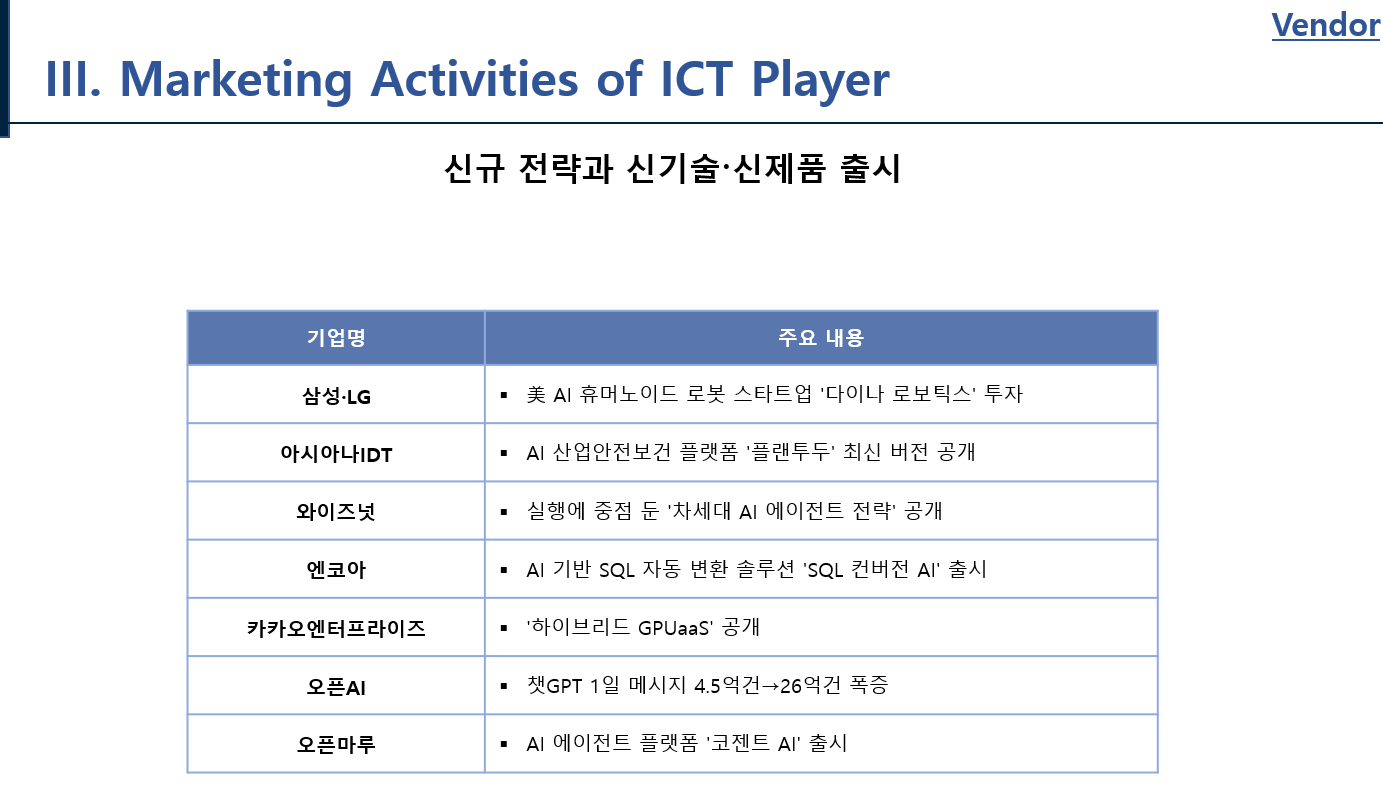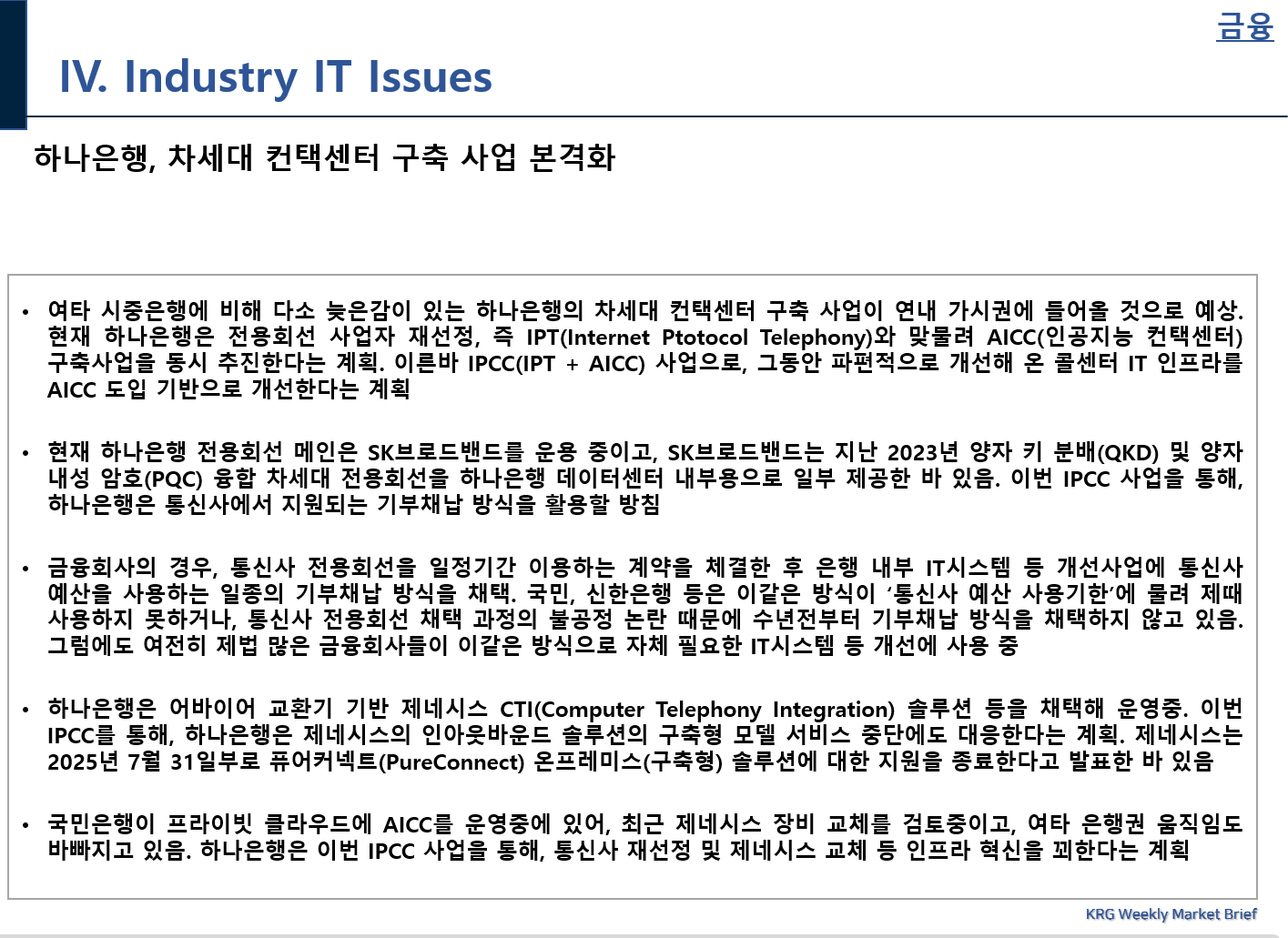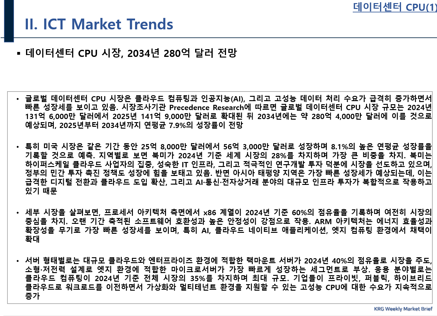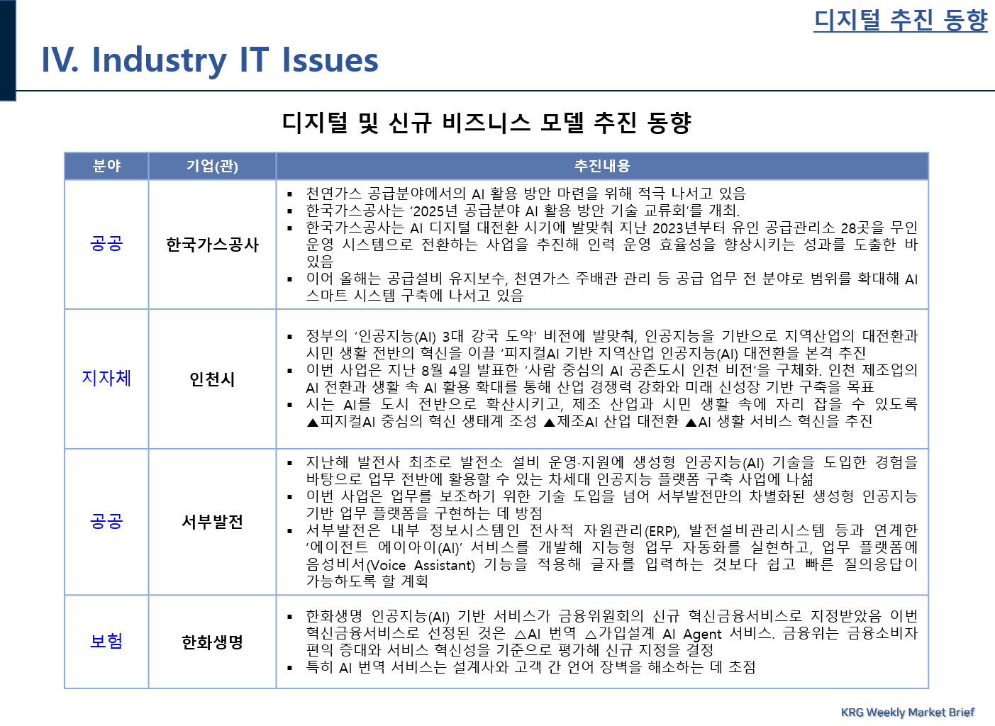 KRG 마켓브리핑 서비스는 매주 주간 단위로 30~35페이지 분량의 시장동향, 주요 IT기업 동향, 전략적 제휴 및 투자 현황, 프로젝트 수주 현황, 고객 IT추진 동향, 각종 세미나 정보 등을 제공합니다.