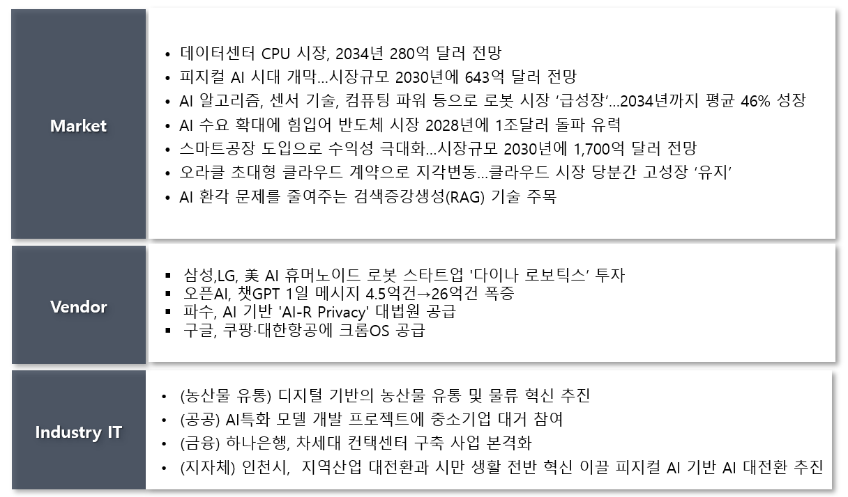KRG가 제공하는 시장정보 서비스는 국내외 IT업계를 둘러싼 시장 동향에 대한 소식 등을 제공하는 서비스입니다. 주간 단위로 제공하는 시장정보 서비스는 매주 국내외 IT업계에 놓쳐서는 안될 시장 정보나 주요 벤더들의 동향 등의 소식들을 일목요연하게 정리해 제공하는 서비스입니다.